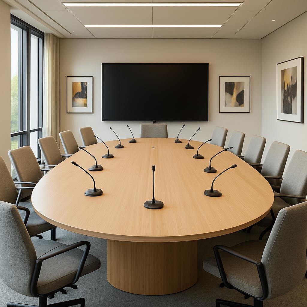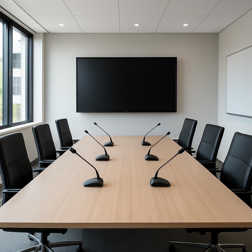 -ไมโครโฟน (Microphone): อุปกรณ์รับสัญญาณเสียง ควรเลือกชนิดให้เหมาะกับขนาดห้อง เช่น ไมโครโฟนตั้งโต๊ะสำหรับห้องขนาดเล็ก หรือไมโครโฟนไร้สาย/ติดเพดานสำหรับห้องขนาดใหญ่
