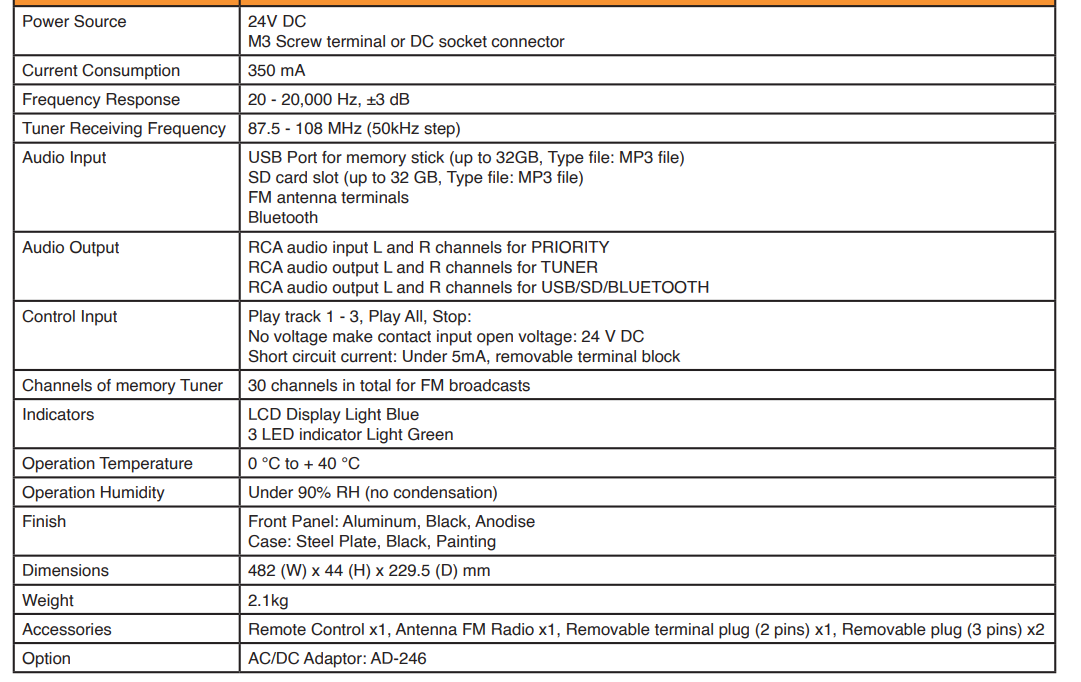 TOA MD-300 เป็นเครื่องเล่นมีเดียและเครื่องรับสัญญาณวิทยุ FM แบบดิจิทัล อุปกรณ์อเนกประสงค์นี้มีช่องเสียบ USB และการ์ด SD สำหรับการเล่นไฟล์ MP3 ได้ พร้อมด้วยฟังก์ชัน Bluetooth สำหรับการสตรีมเสียงได้อย่างง่ายดาย วิทยุสามารถบันทึกช่องได้มากถึง 30 ช่อง TOA MD-300 สามารถติดตั้งบนแร็คอุปกรณ์ ได้