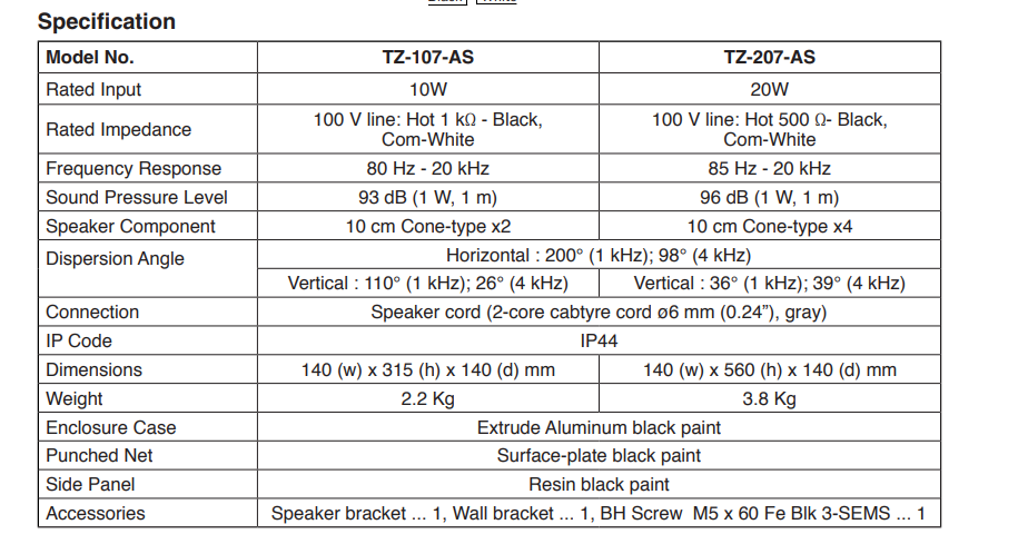 TOA TZ-207-AS กำลังขับ 20 W (Max. 30 W) 100 V line: Hot 500Ω – black, Corn - white ,Frequency Response 85 – 20,000 Hz